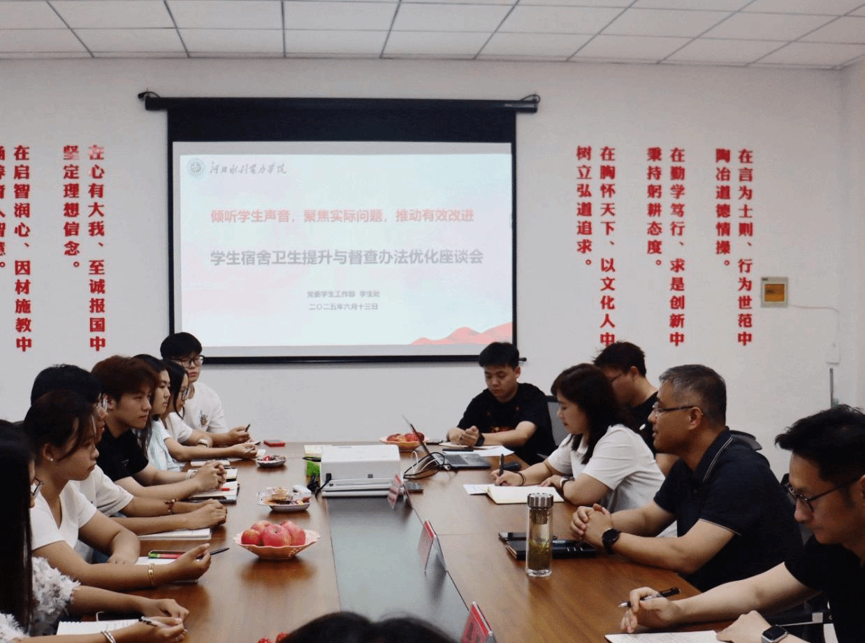 为切实提升学生宿舍工作水平,激发学生自我管理、自我服务的内生动力,6月13日下午,我校召开学生宿舍工作推进会。副校长杨凯出席会议,学生处副处长路鹏、学生管理科科长柳青,学校自律委学生干部和各宿舍楼宿舍长代表参加会议,并进行了面对面交流。柳青首先介绍了开学以来我校宿舍各项工作运行情况,总结了成绩并指出存在的不足,与会学生代表围绕宿舍安全、卫生、管理等各项工作进行了踊跃建言。杨凯充分肯定了前一阶段宿舍各项工作的成效,...