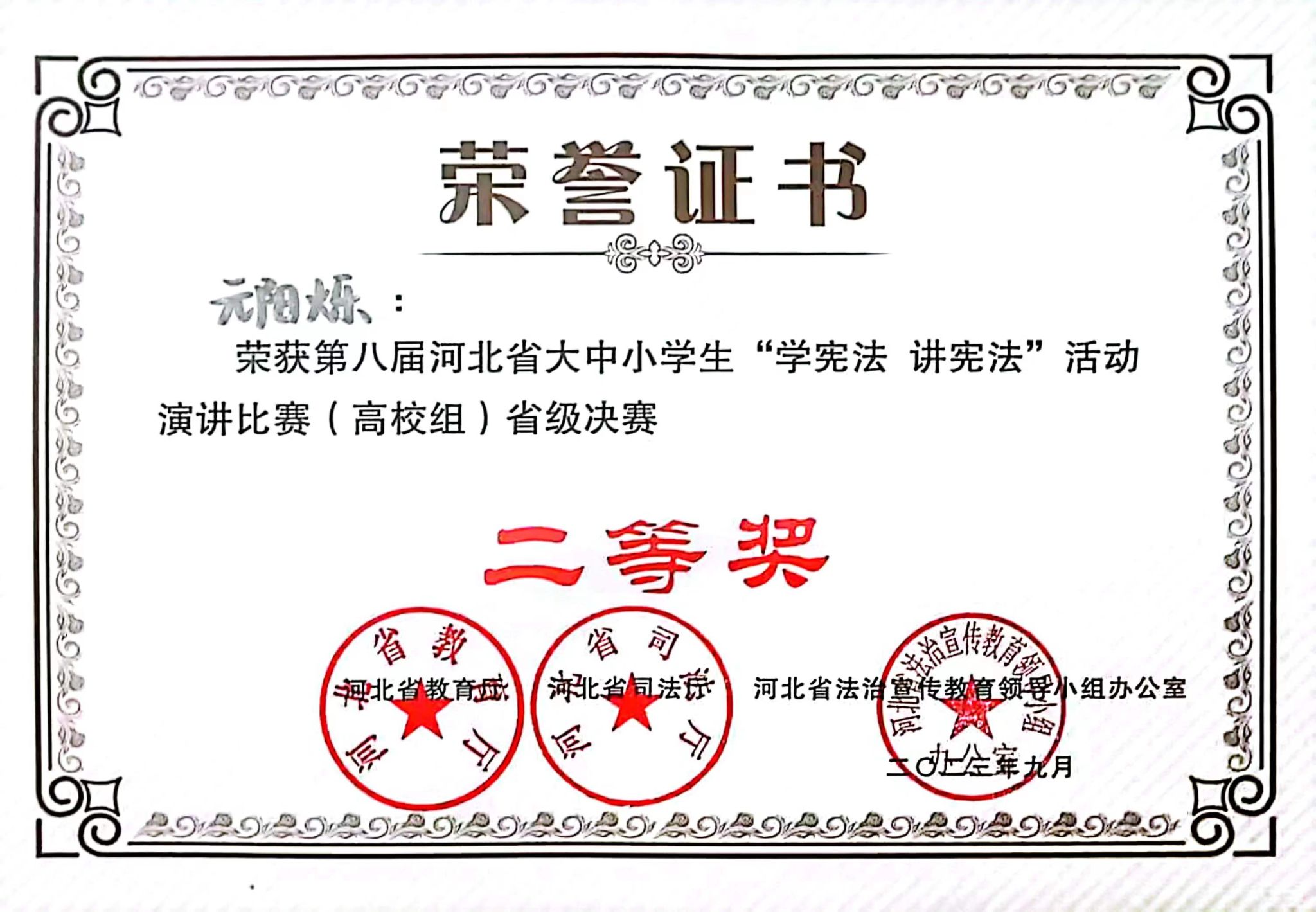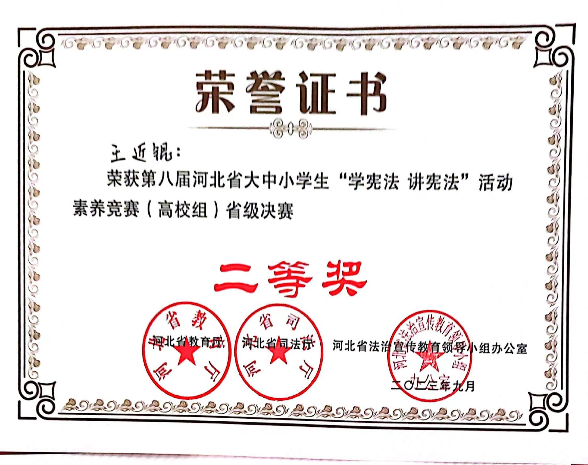 9月26至27日,由省教育厅、省司法厅、省法治宣传教育领导小组办公室主办、河北师范大学承办的第八届河北省学生“学宪法 讲宪法”大赛暨全国选拔赛在石家庄举行。我校电气自动化系元阳烁和计算机系王近锟两位同学分别荣获“河北省大中小学生(大学组)演讲比赛省级决赛二等奖”“河北省大中小学生(大学组)素养竞赛省级决赛二等奖”。