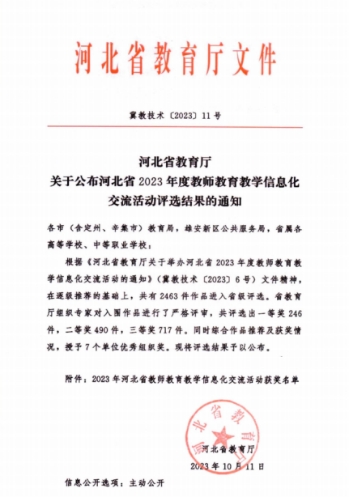 近日,河北省2023年度教师教育教学信息化交流活动获奖名单发布,河北水利工程系张丽军、刘雨青、高永芹团队作品《全站仪坐标测量》获得二等奖。