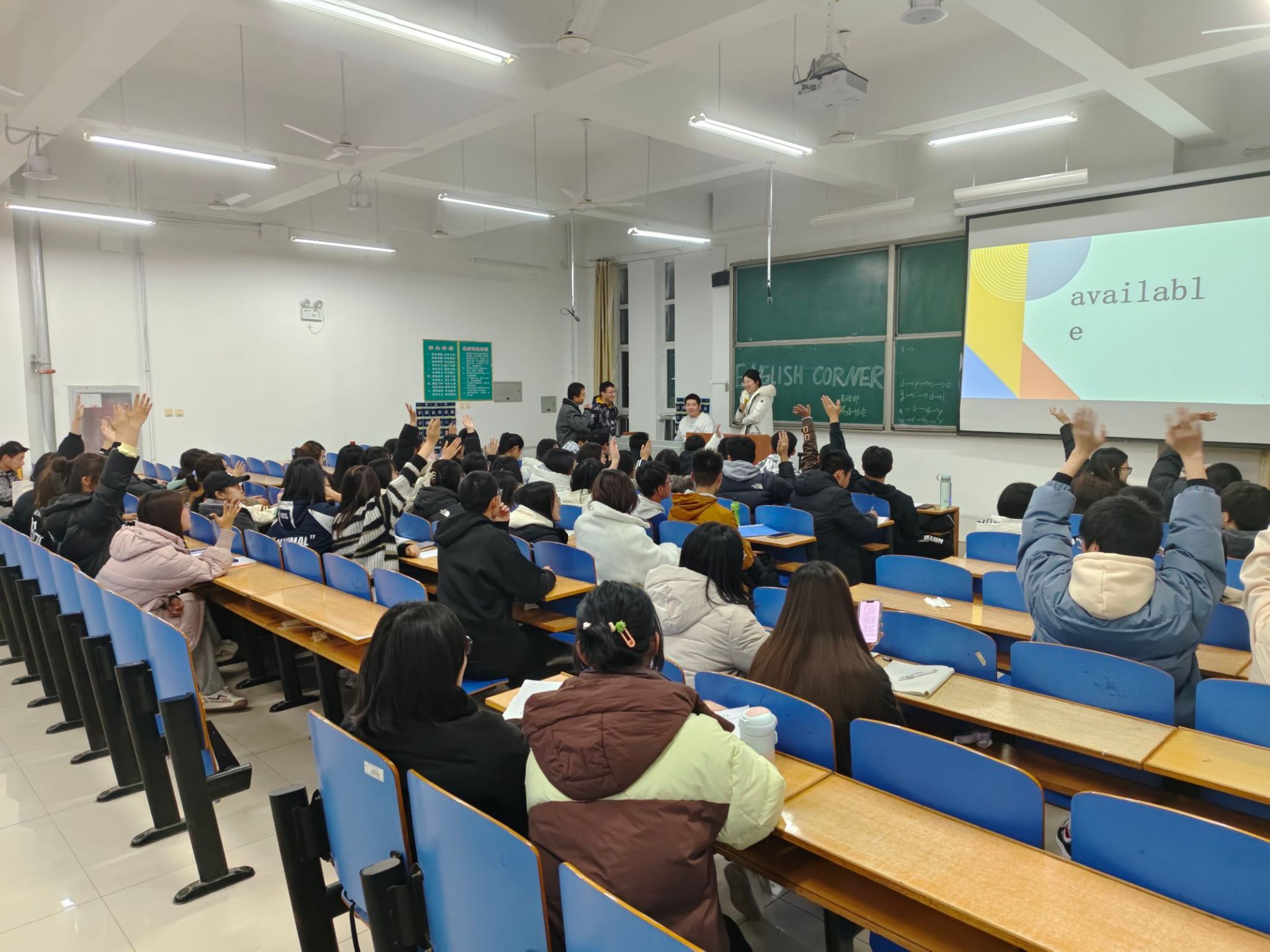 为促进学生英语口语表达能力的提升,丰富校园文化生活,我校于11月30日晚7点在创新楼举办了一场精彩纷呈的英语口语角活动,本次活动由校团委和基础部共同主办,英语协会对此次活动进行了组织策划。基础部英语教师刘建怀和苏畅主持了此次活动,为学生们解答疑惑,提供专业的口语建议,帮助学生更好地理解和运用英语,提升口语水平。