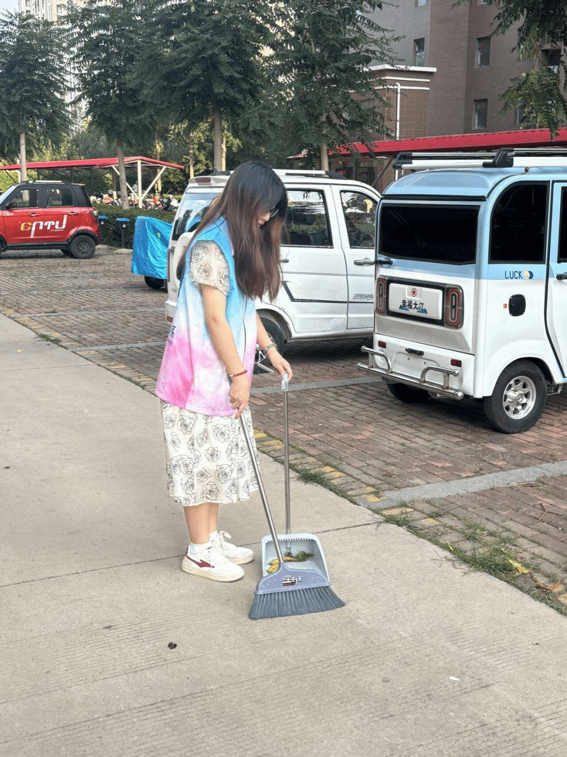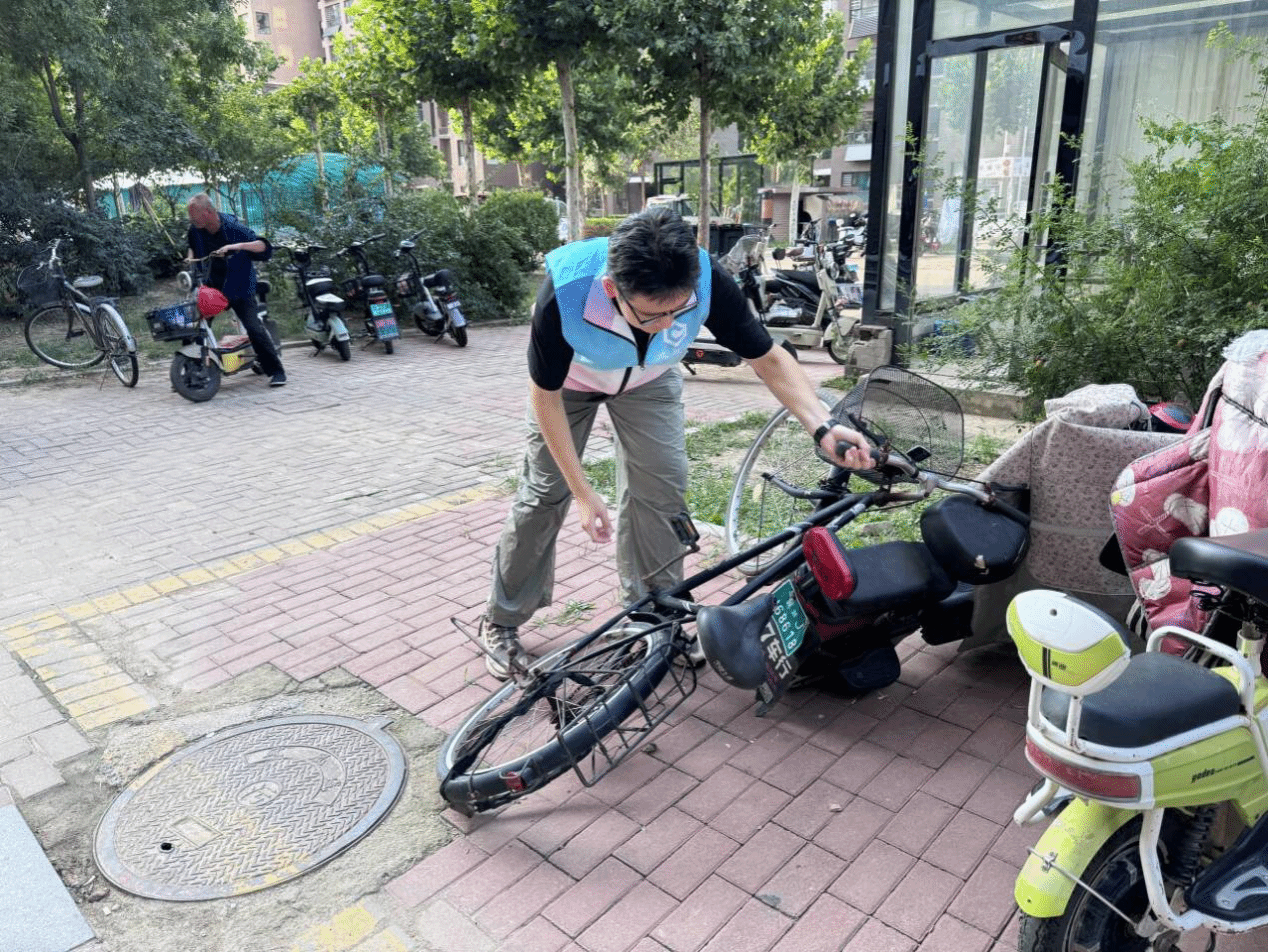 清洁小组的志愿者们手持扫帚、垃圾袋等工具,对社区道路、绿化带及休闲区进行了全面细致的清扫。经过一番努力,社区环境焕然一新,赢得了过往居民的一致好评。与此同时,另一组志愿者将被风吹倒的自行车一一扶起,把随意停放的自行车在指定的停车区域整齐排列,原本杂乱无章的停车区变得井然有序,不仅美化了社区环境,也方便了居民的出行。