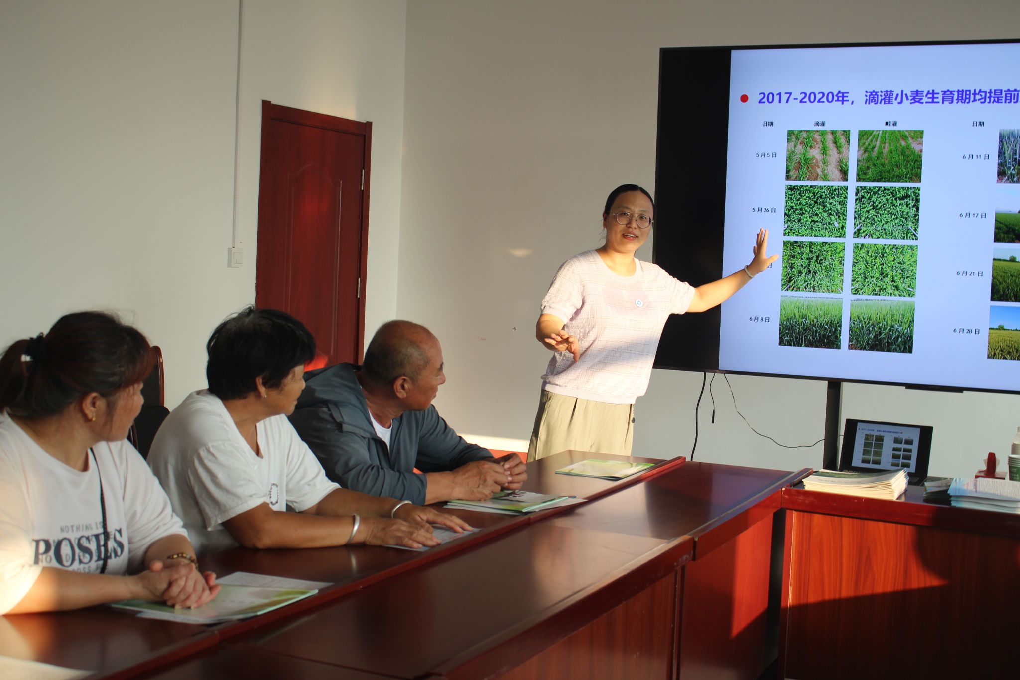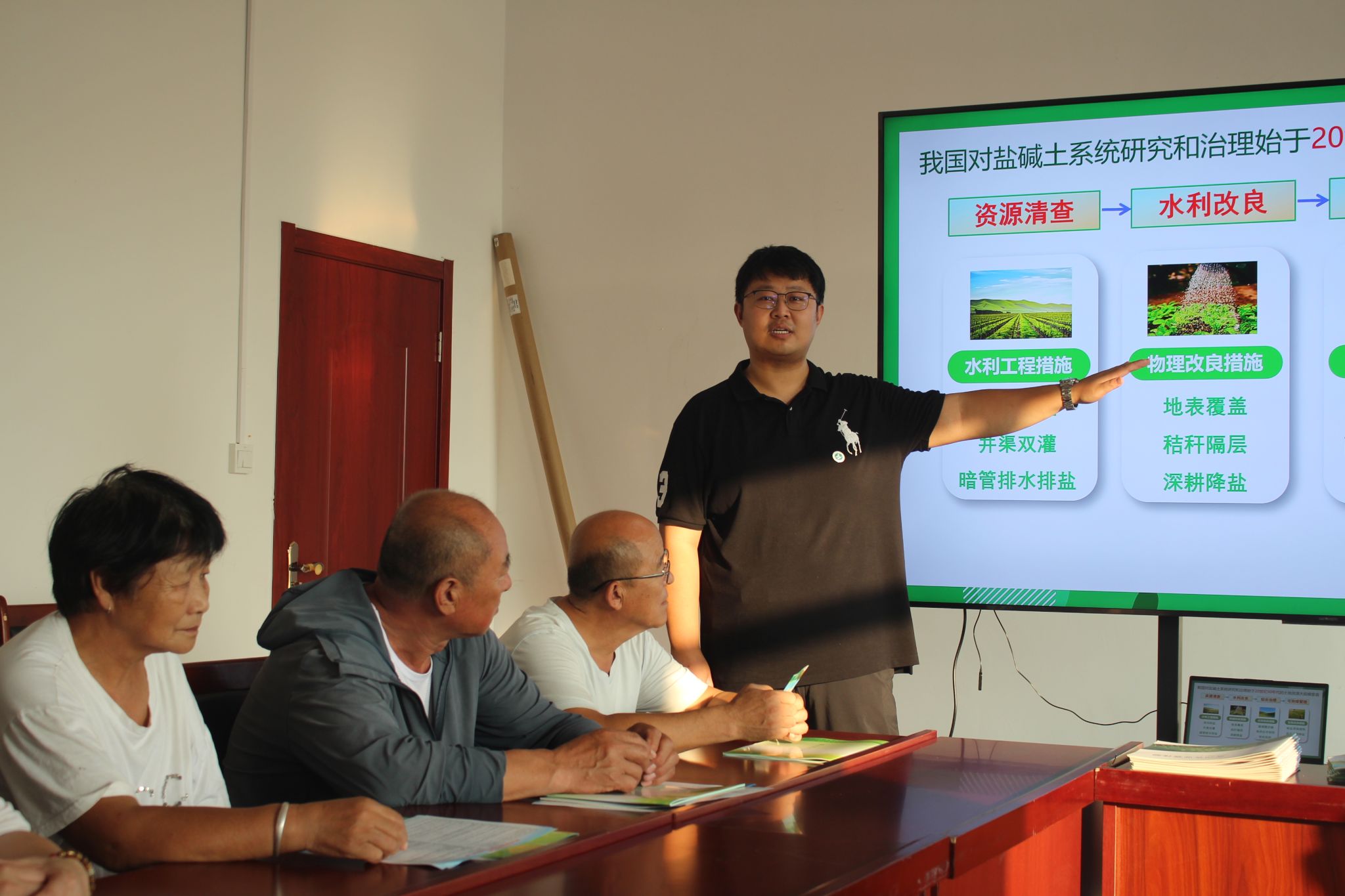 在春润合作社一楼会议室,张文聪博士为大家开展了《农业高效利用盐碱地资源探讨》的主题讲座,深入浅出地讲解了盐碱地改良的最新研究成果与技术路径,为农民们打开了盐碱地变良田的新视野。王亚晖博士讲授了《智能水肥一体化及节水灌溉技术》,详细介绍了这些高效节水、节肥的现代农业技术,让大家直观感受到科技对提升农业生产效率的巨大潜力。讲座结束后,两位博士深入田间地头,与农民朋友面对面交流,手把手指导,田间互动气氛热烈,大家纷纷对二位博士表达感谢,表示通过本次活动对现代农业科技有了更深入的认识和更强烈的应用意愿。