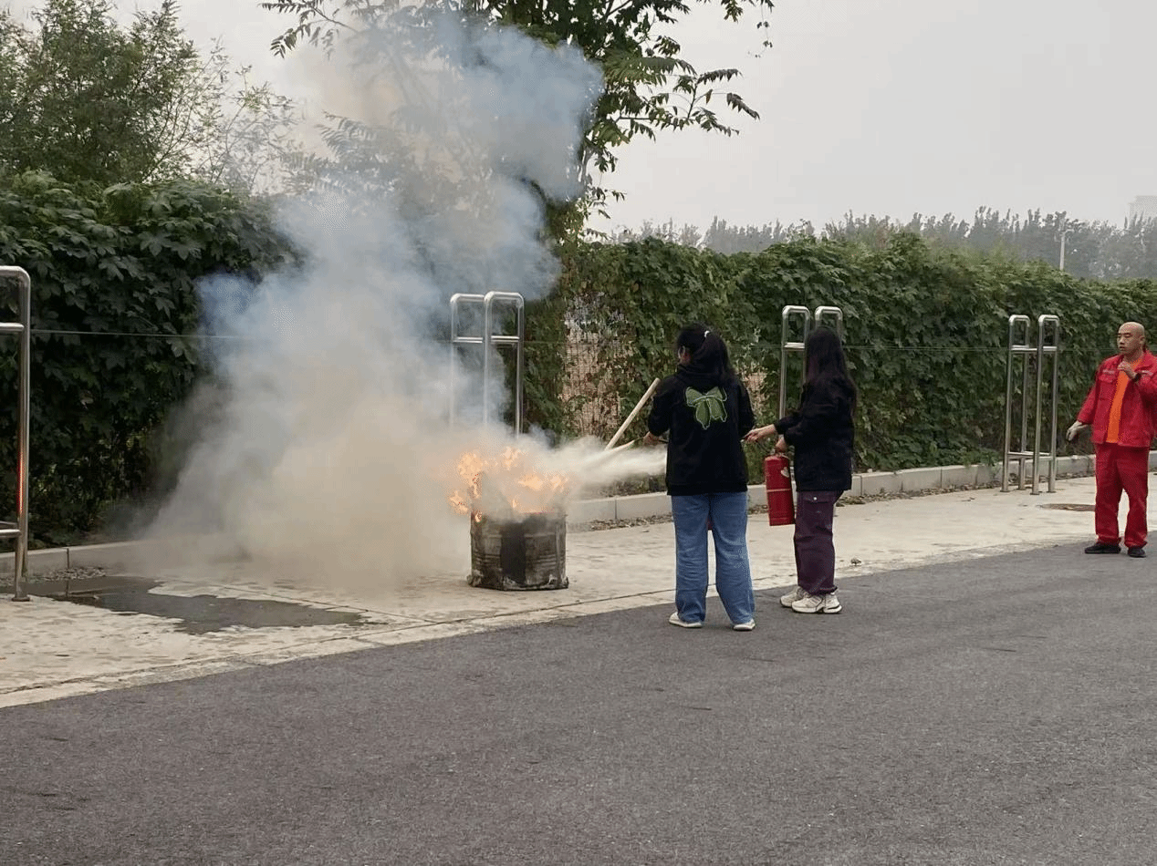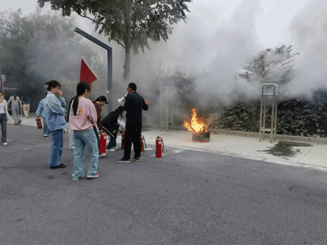 逃生疏散演练结束后,全体人员在一号公寓楼前广场开展灭火演练。首先,罗占军向同学们介绍了校园防火灭火知识,讲解了灭火器的使用方法和注意事项。随后,全体演练人员在工作人员的指导下依次上场进行了灭火演练。