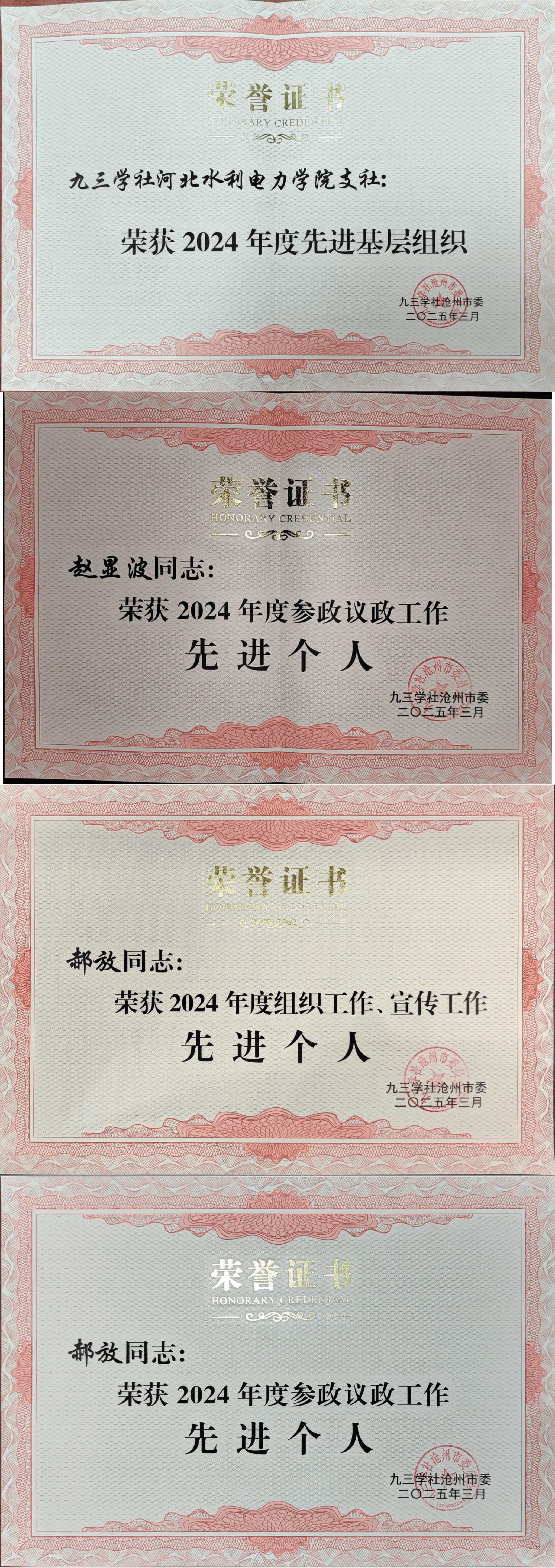 我校支社凭借突出的工作成效荣获“2024年度先进基层组织”称号;支社副主委郝放副教授获评“2024年度参政议政工作先进个人”“2024年度组织工作、宣传工作先进个人”;赵显波博士获评“2024年度参政议政工作先进个人”。这些荣誉的取得,既是对支社建设发展的充分肯定,更是学校党委高度重视、精心指导的成果体现。